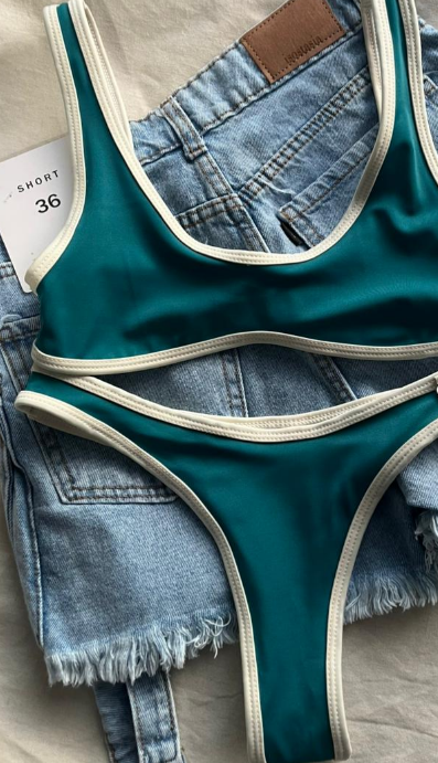 Top entero y bombacha colaless con vivo crema. Corpiño con doble forreria y abertura para poner rellenitos