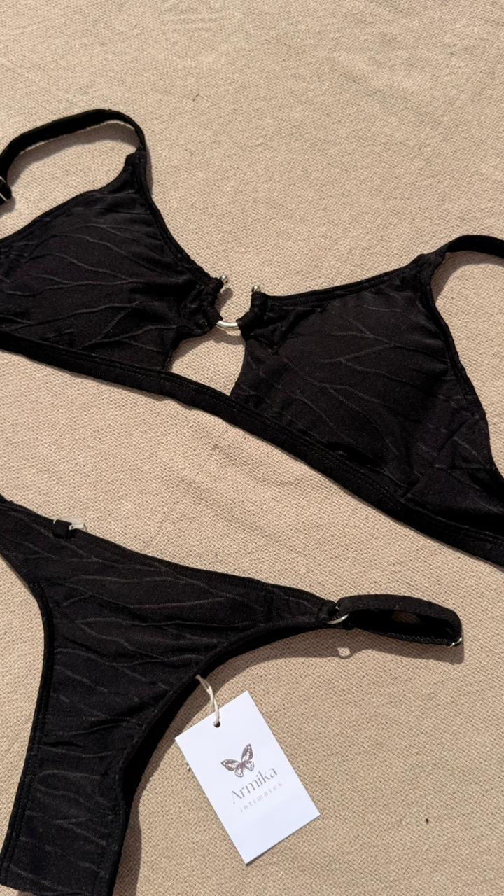Bikiti estilo top fijo con breteles regulables, espalda para atar y tazas desmontables. Bombacha colaless regulable.
