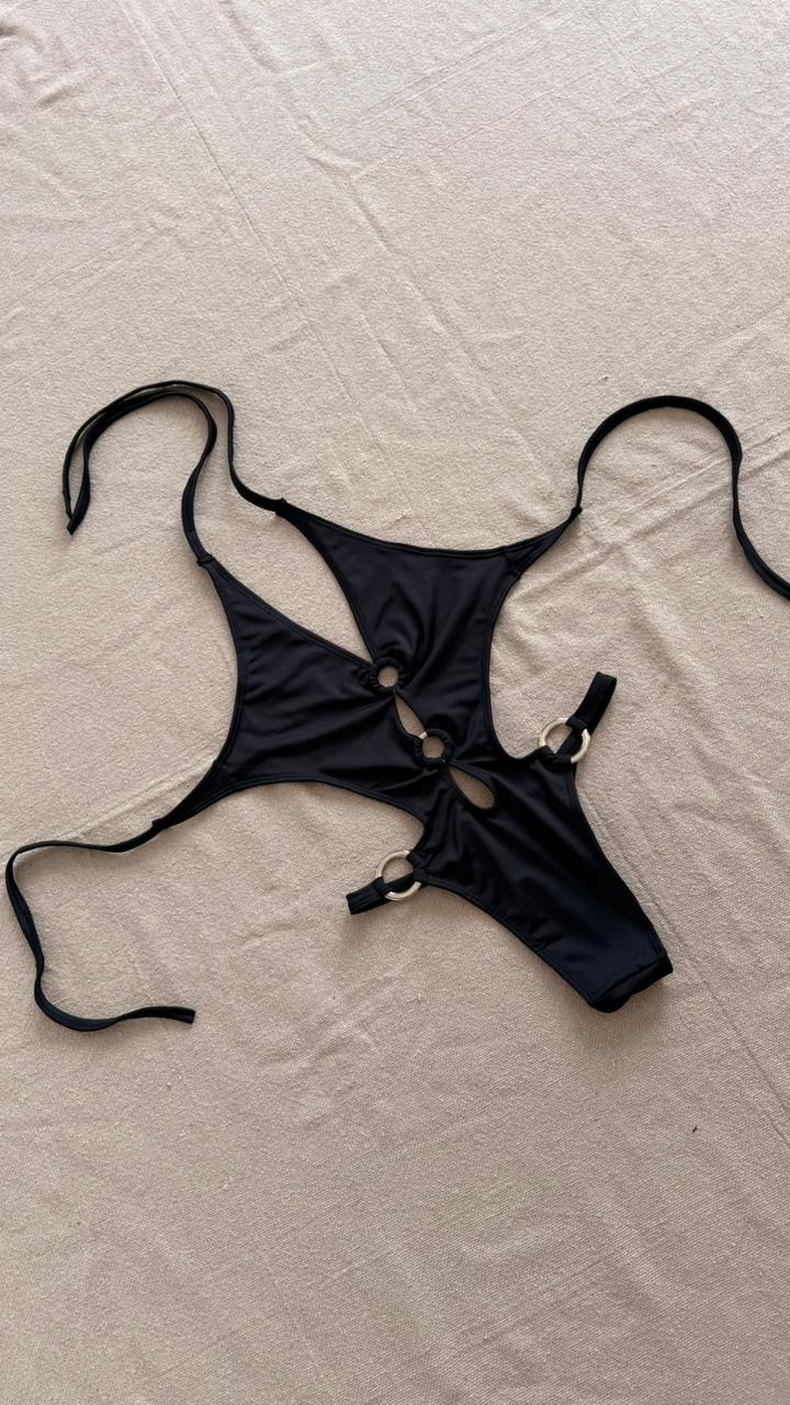 Confeccionada en lycra pesada de colores lisos. La trikini Nova cuenta con costuras embutidas con elásticos internos para un calce firme y cómodo. Presenta dos argollas en el abdomen y dos argollas más grandes en las caderas, diseñadas para realzar y favorecer la forma natural del cuerpo. Está completamente forrada y se ajusta mediante tiras para atar en el cuello y la espalda, brindando sujeción y la posibilidad de regular la prenda a gusto.