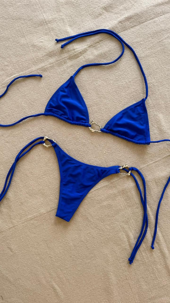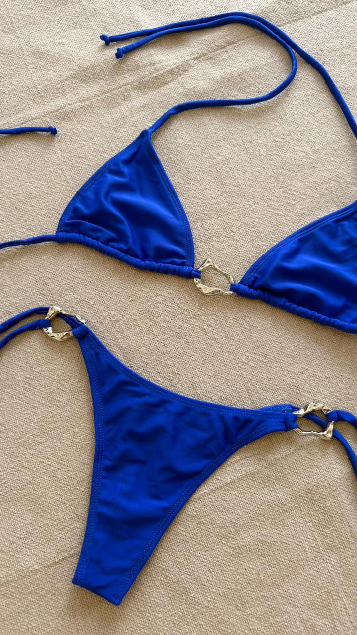 Bikini parte de arriba triángulo para atar doblemente forrado para agregar tazas desmontables de asi quererlo, trae en el medio un avío de Zamak que no se oxida ni se recalienta con el sol .