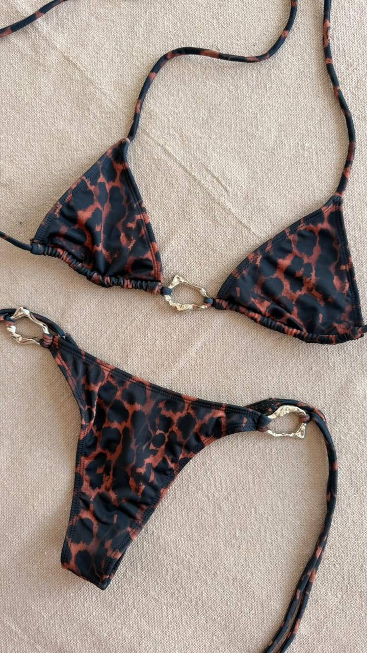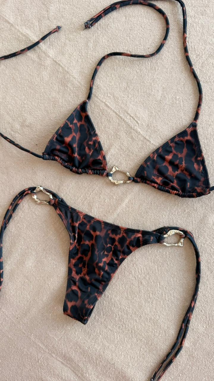 Bikini parte de arriba triángulo para atar doblemente forrado para agregar tazas desmontables de asi quererlo, trae en el medio un avío de Zamak que no se oxida ni se recalienta con el sol .