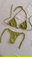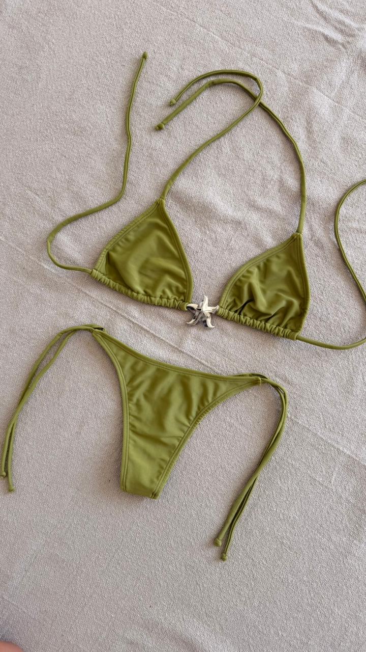 Bikini parte de arriba triángulo para atar doblemente forrado para agregar tazas desmontables de asi quererlo, trae en el medio un avío de Zamak que no se oxida ni se recalienta con el sol .