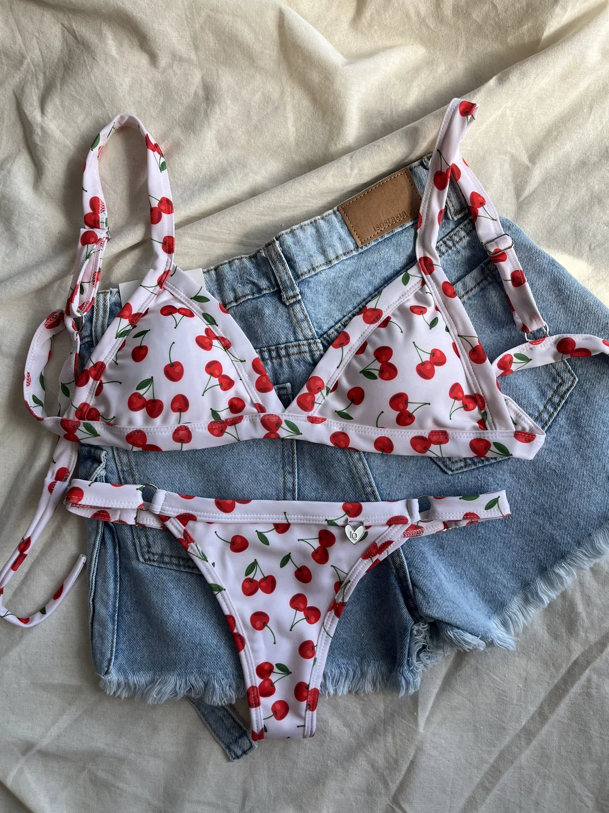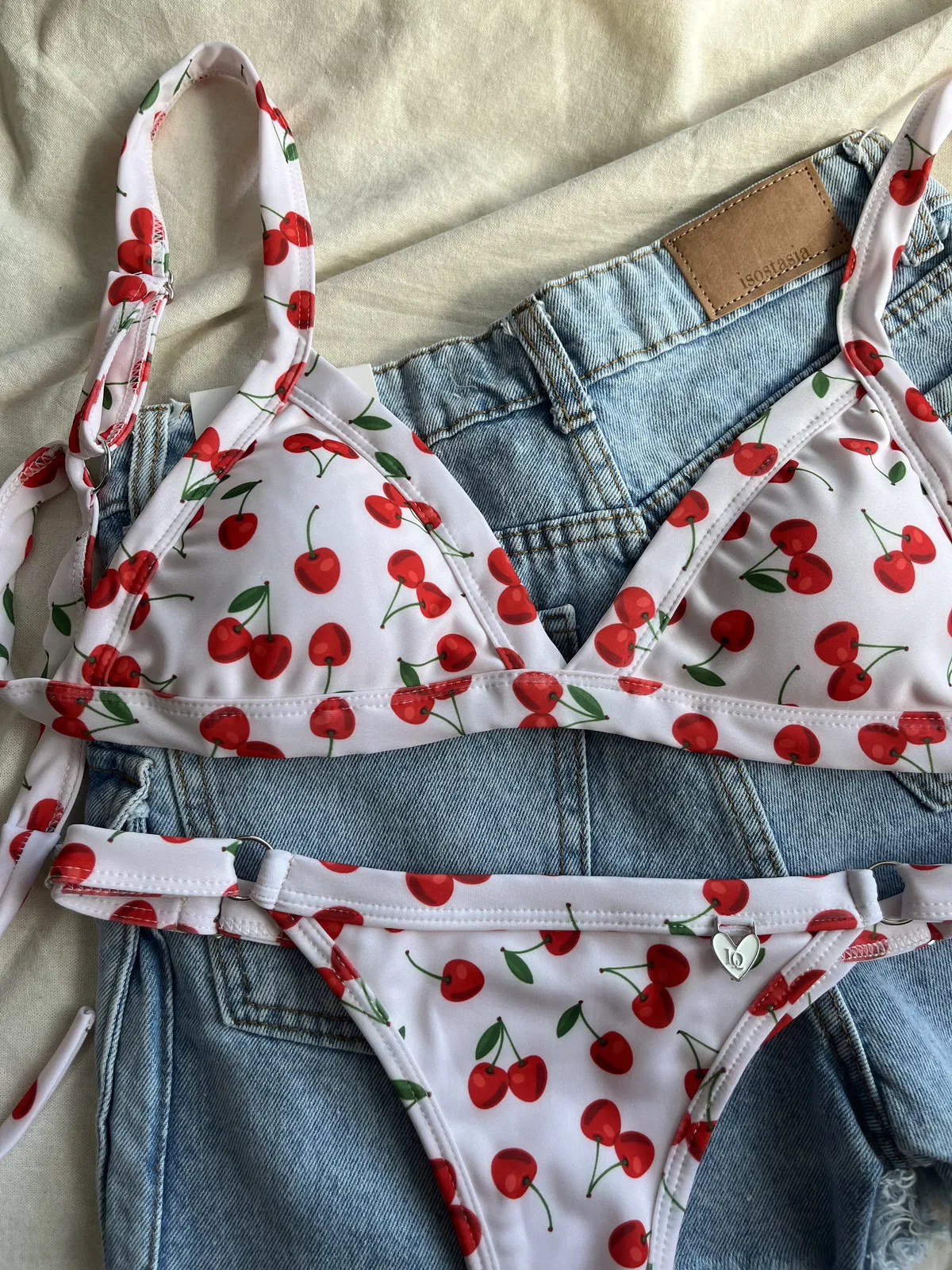 Triángulo lycra tricot estampado. Corpiño con breteles regulables y espalda para atar. Colaless regulable